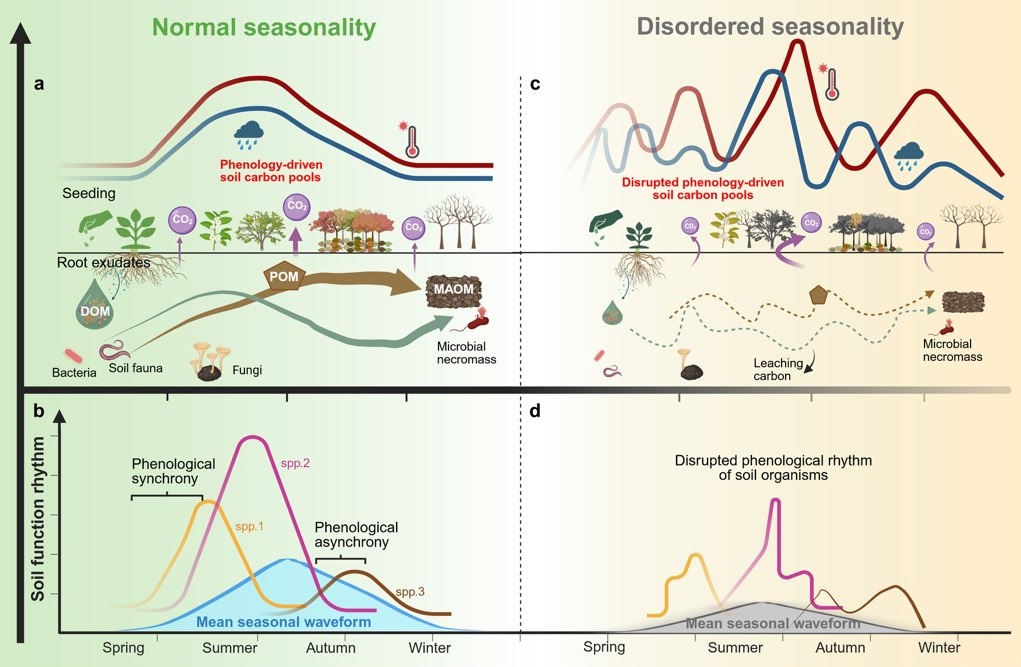 圖. 氣候驅(qū)動的季節(jié)性物候紊亂可能削弱土壤碳的持久性:(a)在正常季節(jié)條件下,地上與地下生物之間協(xié)調(diào)的物候節(jié)律調(diào)節(jié)著碳輸入、微生物轉(zhuǎn)化過程以及持久性礦物結(jié)合有機質(zhì)的形成。土壤動物(如蚯蚓)示意性地代表了參與土壤碳轉(zhuǎn)化的關(guān)鍵功能類群。DOM,溶解性有機質(zhì);POM,顆粒有機質(zhì);(b)土壤生物(例如,物種1-3)在不同季節(jié)表現(xiàn)出獨特的物候活動模式,對土壤功能節(jié)律的貢獻各不相同。平均季節(jié)波形反映了由多個類群產(chǎn)生的綜合信號;(c)在季節(jié)秩序紊亂的情況下,氣候變化破壞了這種同步性。植物、微生物和動物物候活動在時間和強度上的變化,可能導致碳輸入與微生物需求脫節(jié),分解連續(xù)過程碎片化,并改變營養(yǎng)級相互作用,最終降低土壤碳持久性和生態(tài)系統(tǒng)恢復力;(d)此類紊亂通過改變土壤生物的物候模式,可能使土壤功能節(jié)律趨于平緩并破壞其同步性。