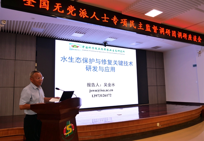 座談會(huì)上,陳洪松向調(diào)研團(tuán)介紹了研究所基本情況、成果產(chǎn)出和未來(lái)研究規(guī)劃。吳金水研究員重點(diǎn)匯報(bào)了研究所在農(nóng)業(yè)農(nóng)村水污染源頭治理關(guān)鍵技術(shù)創(chuàng)建及應(yīng)用、洞庭湖濕地生態(tài)修復(fù)模式創(chuàng)新及影響等水生態(tài)保護(hù)與修復(fù)方面的工作進(jìn)展,組織無(wú)黨派人士和有關(guān)專家參與民主監(jiān)督的情況,提出了有效改善水生態(tài)環(huán)境問(wèn)題的建議。