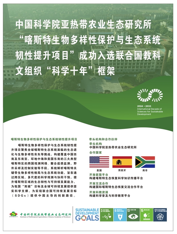 11月28日,中國科學(xué)院亞熱帶農(nóng)業(yè)生態(tài)研究所陳洪松研究員牽頭組織申報的“喀斯特生物多樣性保護(hù)與生態(tài)系統(tǒng)韌性提升項(xiàng)目”(Karst Biodiversity Conservation and Ecosystem Resilience Enhancement Programme,簡稱喀斯特生物多樣性)成功入選聯(lián)合國教科文組織(UNESCO)2024–2033年科學(xué)促進(jìn)可持續(xù)發(fā)展科學(xué)十年(International Decade of Sciences for Sustainable Development ,IDSSD)實(shí)施倡議。